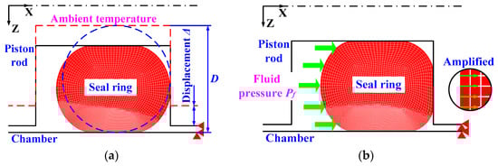 The modeling process is comprised of two steps, as shown in Figure 4. In the first step, degrees of freedom in the x and z directions of the chamber profile are eliminated. Meanwhile, a displacement Δ in the z direction is set on the profile of the piston rod to generate an initial compression rate for the seal ring. The environmental temperature T is set as the initial condition. In the second step, fluid pressure Pf is set at nodes on the left side of the deformed seal ring. It is assumed that the left side beside the seal ring is the higher-pressure side, while the other side is the air side.