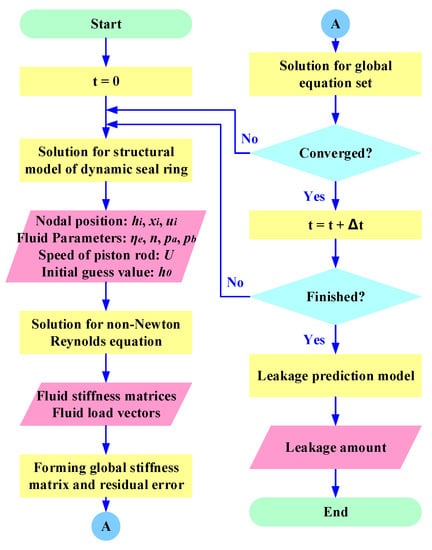 The development of the leakage prediction calculation method for dynamic seal rings in underground equipment is shown in Figure 6. In the beginning, the FE model of the seal ring is built and solved with the thermal–structural coupled method. The coordinates of the nodes in the domain of the seal ring as well as the structural stiffness matrix can be obtained. Then, parameters of fluid attribution, the velocity of the piston rod and an initial guess of h0 are input to solve the Reynolds equation of non-Newtonian fluid to obtain the loading vector and stiffness matrix of the interface element. The stiffness matrix of the whole domain is obtained by summing the stiffness matrix of each interface element. Meanwhile, the global residual vector is obtained by integrating the loading vector in the fluid domain. Equation sets are solved using the Newton–Raphson method. If the solution converges, enter the next time step and recalculate the process above. Otherwise, return to the FE model and change the position of nodes as well as the initial guess of h0. Repeat the process until the solution converges. When the calculating time is reached, the leakage amount of the dynamic seal ring is worked out according to the leakage prediction model.