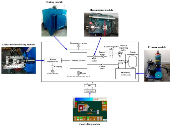 To validate the proposed method, a test to measure the leakage amount under high temperature and high pressure is designed. The test system with high temperature and high pressure for seal rings is shown in Figure 7. Five modules are contained in the system: the linear motion driving module, heating module, pressure module, measurement module and controlling module.