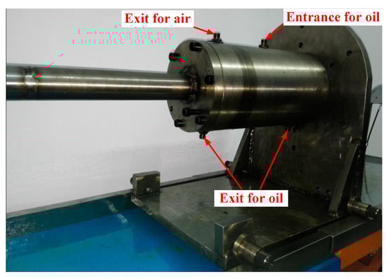 The fixture used in the test is shown in Figure 8. The main body of the fixture is a cylindrical chamber that has four holes on its external surface: one is for oil supply, one is for exhausting air, and the other two are for oil outflow. The inner diameter of the cylindrical chamber is 140 mm, while the external diameter is 195 mm.