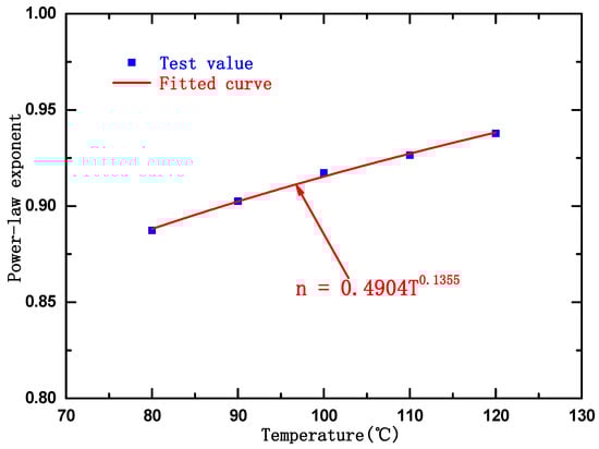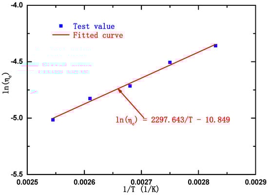 Since the test is operated under standard atmospheric pressure, the influence of pressure can be ignored. So, the last item in Equation (47) is taken as zero. Comparing Equation (46) with Equation (47), we have the following: A = 1.9424 × 10−5, B = 2297.643. The equivalent viscosity is as follows:
