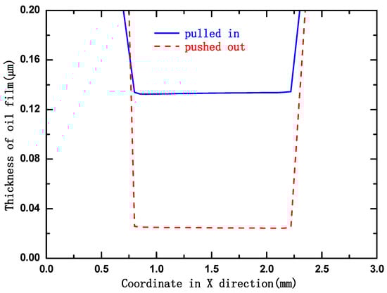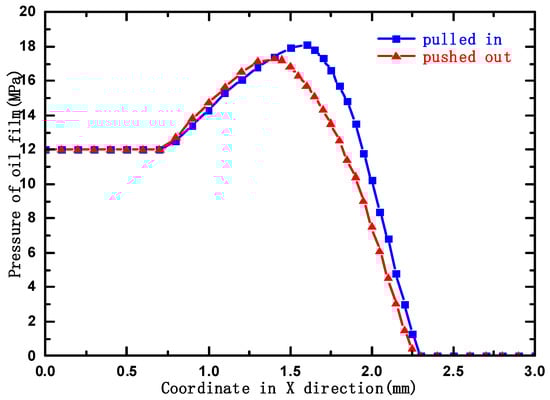 The distribution of fluid pressure in the sealing clearance is shown in Figure 14. It can be seen that when the piston rod is pulled in, the maximum pressure is greater than that when the piston rod is pushed out. The distribution of film thickness is shown in Figure 15. When the piston rod is pulled in, the film thickness is greater than that when the piston rod is pushed out. The reason for this is related to the distribution of fluid pressure. When the piston rod is pushed out, hydrodynamic pressure is smaller. The surface of the seal ring squeezes the fluid to reduce the deformation. A new equilibrium between hydrodynamic pressure and deformation stress is built. So, the clearance of the sealing region is reduced, and the film thickness is reduced as well.