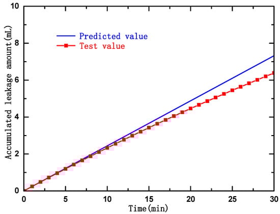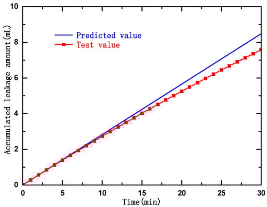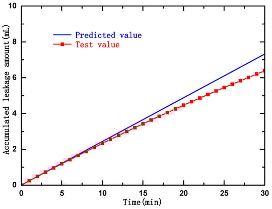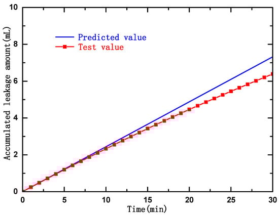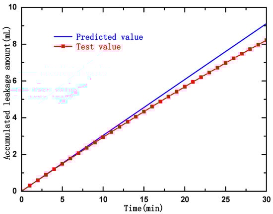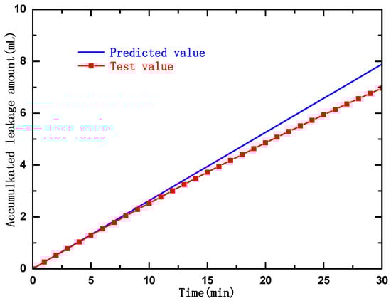 A comparison of the leakage amount between the predicted value and test value is shown in Figure 16. We can see that the predicted value is slightly bigger than the test value. That is because as the fluid leaks, the fluid pressure in the fixture is decreased gradually. The reduction in pressure difference leads to a smaller leakage. However, the prediction result is still able to reflect the trend of the leakage amount properly.