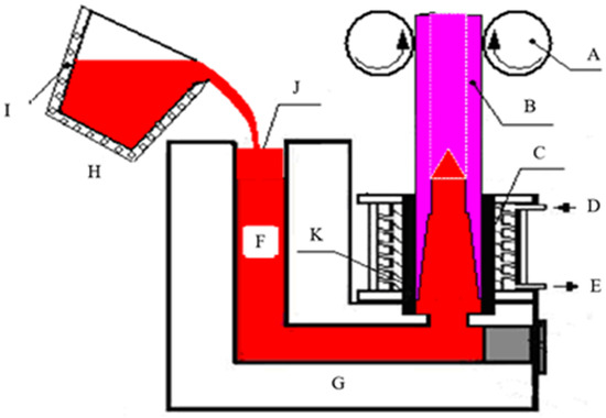 The schematic diagram of the fabrication of ductile iron pipe. A—drawing machine, B—hollow ductile iron casting, C—crystallizer, D—water entry, E—water outlet, F—iron melt, G—continuous casting furnace, H—container, I—heater, J—pouring gate, and K—cooling system.