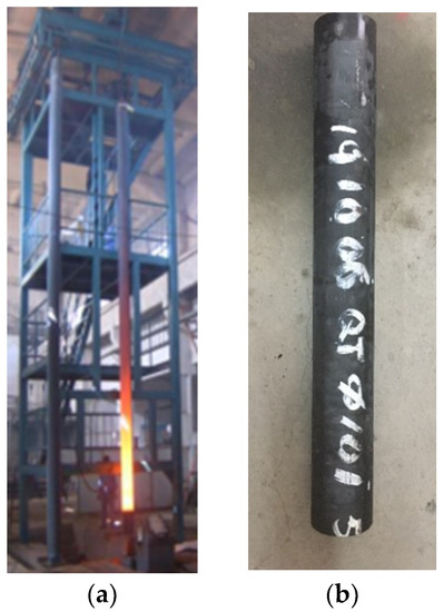 The vertically continuous casting method was used to fabricate a hollow ductile iron pipe with a diameter of 200 mm and a thickness of 20 mm. The detailed fabrication procedure can be described as follows. An amount of 60% pig iron, 20% low-carbon steel scrap, and 20% ductile iron return charge were used as raw materials. Firstly, the raw materials were melted in a medium-frequency induction furnace and the chemical composition of iron melt was determined to be 3.30 ± 0.05% C, 1.6 ± 0.05% Si, Mn ≤ 0.2%, P ≤ 0.015%, S ≤ 0.015%, 0.6% Cu, Ni ≤ 0.6%, Cr ≤ 0.3%, and the balance Fe. The iron melt was held at 1530 °C for 20 min and then poured into a 300 kg container (H in Figure 1), in which 4.5 kg of Ce–Mg nodularizer was placed in advance. When the spheroidizing reaction finished, 3.0 kg of 75% ferrosilicon inoculant was added for inoculation. After nodularization and inoculation treatment, the temperature of the iron melt was approximately 1460 °C, and the iron melt contained approximately 2.60% Si and 0.035–0.045% Mg. Then, iron melt was poured into a continuous casting furnace (G in Figure 1). Seeding was positioned in the crystallizer (C in Figure 1). When the iron melt contacted the seeding on the crystallizer, it solidifies. With the drawing machine (A in Figure 1) working at the speed of 50 mm per step and held for 8 s every step, a casting pipe could be obtained. The fabricated casting pipe is shown in Figure 2. It can be seen that no obvious casting defects could be detected in the pipe. This casting method has been approved to be able to reduce impurities compared with horizontal continuous casting [24].