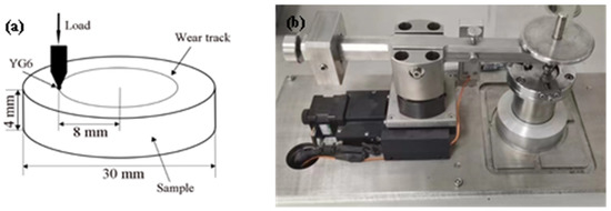 The tribological properties of ADIs were conducted on a ball-on-disk tribotester, which was a homemade piece of equipment. The schematic diagram is presented in Figure 3. The ADI sample with a diameter of 30 mm and thickness of 4 mm was set as the disk, the initial roughness of which was measured to be approximately 0.09 μm via an OLS4000 confocal laser scanning microscope (Olympus Corporation, Tokyo, Japan). A hard metal YG6 WC ball with a hardness higher than 90 HRA was set as the ball. The diameter of the wear tack was 16 mm. In order to investigate the tribological behavior of ADI under different services, the rotating rates were set to be 100 r/min, 300 r/min, and 500 r/min and the normal loads were set to be 5 N, 10 N, and 20 N, respectively. For each condition, at least three samples were repeated. The sliding distance for all the wear tests was the same (500 m), which corresponded to the wear time of 6000 s, 2000 s, and 1200 s for the samples at the rotating rates of 100 r/min, 300 r/min, and 500 r/min. The weight of disks before and after wear tests were measured on a FA1004B analytic balance (Shanghai Sunny Hengping Scientific Instrument Co., Ltd, Shanghai, China) with a minimum resolution of 0.01 mg to determine weight loss. The value of the friction coefficient at steady stage was obtained by averaging the values of the repeated three curves.