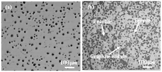 Optical images of as-cast ductile iron (a) unetched and (b) etched.