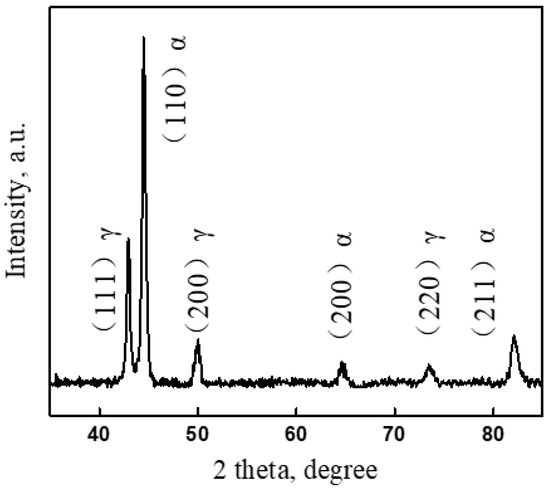 The ADI sample’s XRD patterns are displayed in Figure 6. The peaks of α and γ phases were detected. The volume fraction of γ phase according to XRD results was approximately 30%, and the carbon concentration in retained austenite was approimately 1.87%. The stability of retained austenite was sensitive to its carbon content [25,26]. Retained austenite that existed at room temperature has been detected in medium carbon bainitic steel containing approximately 0.39 carbon [27]. Therefore, the γ phase in the present study was stable because of the high carbon concentration in it. The microstructure containing nanoscale α phase and high-carbon γ phase was commonly observed in ADI [28].