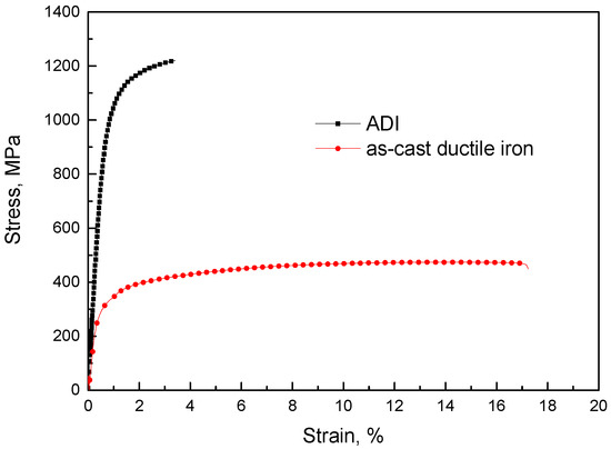 Figure 7 shows the typical stress–strain curves of the as-cast ductile iron and ADI. The as-cast ductile iron exhibited a yield stress of 290 MPa, ultimate tensile strength of 470 MPa, and elongation of 16.9%. After austempering treatment, the strength was increased obviously. The yield strength of ADI was approximately 976 MPa and the ultimate tensile strength was approximately 1220 MPa. However, the ductility was drastically reduced compared with the as-cast counterpart. The elongation of ADI was approximately 3.4%. The matrix of the as-cast ductile iron was composed of ferrite and pearlite (Figure 4b), where ferrite was a very soft phase. Therefore, during the tensile test, ferrite was ready to be plastically deformed, which resulted in rather low strength. Nonetheless, the ausferrite in ADI contained nanoscale α phase and supersaturated γ phase. The phase boundaries between α and γ provide strength for ADI. It has been confirmed that carbon atoms were present in the ferrite in the bainite of bainitic steels [29]. The α phase in ausferrtie was obtained through austempering treatment, which was a similar treatment to the process of fabricating bainitic steel; thus, it is believed that small amounts of carbon atoms existed in α phase of ADI. Consequently, α phase should contain distortion energy and was a hard phase. Furthermore, approximately 1.87% carbon atoms in γ phase increased the strength of γ phase by solution strengthening. As a result, ADI exhibited a good strength because of carbon supersaturated in the matrix and fine microstructure.