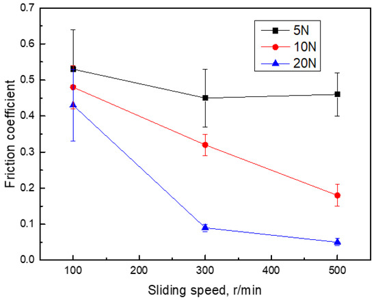 Figure 9 depicts the variation of the friction coefficient at the steady stage with sliding speed. Under a given speed, it can be seen that the friction coefficient dropped as the load increased. The decreasing tendency was not apparent when the sliding speed was slow. The friction coefficient decreased significantly with the normal load applied at high sliding speed. Moreover, the friction coefficient decreased a little at low normal load (5 N) but decreased obviously at high normal load (20 N) with the increase in sliding speed. The friction coefficient reached the lowest value (around 0.1) when the normal load was 20 N and the sliding speed was 500 r/min. During the wear test, the surface roughness and the development of a graphite lubricating layer on the tribosurface were critical factors to determine the friction coefficient under various service conditions. The variation of the friction coefficient will be discussed by combining the microstructure of the worn surface in the following.
