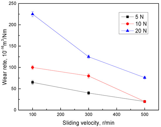 Figure 10 presents the wear rate of ADI under various service conditions. It can be seen that the wear rate increased with the increase in the normal load, while it decreased with an increase in sliding speed. According to the Archard equation [18], the wear rate of materials is proportional to the normal load and inversely proportional to the hardness of materials. Hence, increasing the normal load was conducive to the rise in ADI’s wear rate in the present study. Meanwhile, the friction coefficient is another important factor affecting wear resistance [30]. The friction coefficient was reduced with the increase in the normal load and sliding speed (Figure 9). Therefore, the wear rate decreased with the increase in sliding speed under a certain normal load. Moreover, the difference in the wear rate under different normal loads at low sliding speed was more obvious than that at high sliding. This was due to the large reduction in the friction coefficient at sliding speed (Figure 9).