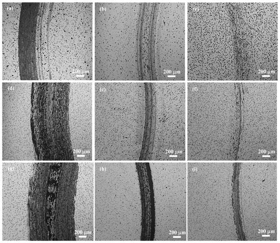 Optical images of the worn surface under different wear conditions: (a) 5N and 100 r/min, (b) 5N and 300 r/min, (c) 5N and 500 r/min, (d) 10N and 100 r/min, (e) 10 N and 300 r/min, (f) 10N and 500 r/min, (g) 20N and 100 r/min, (h) 20 N and 300 r/min, and (i) 20 N and 500 r/min.
