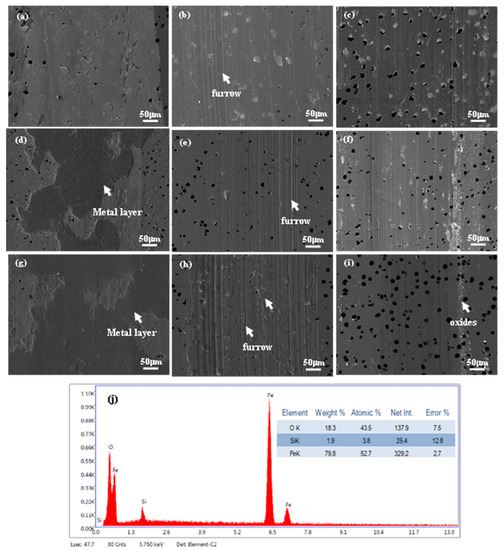 The wear mechanism of ADI differed under different service conditions. To further explore the influence of service conditions on the wear mechanism of ADI, the SEM morphology of the worn surface is presented in Figure 12. No obvious furrows were detected for samples at a low rotating rate (100 r/min) (Figure 12a,d,g). For samples at a high rotating rate (300 r/min), obvious furrows were observed (Figure 12b,e,h). Wear debris was detected in addition to furrows (Figure 12c,f,i) when further increasing the sliding speed (500 r/min). Therefore, it could be inferred that the ADI exhibited different wear mechanisms under different service conditions. For the samples at a low rotating rate, the matrix was deformed plastically and then spread on the worn surface with the increase in normal load (Figure 12d,g). This indicated that adhesive wear was predominant at a low sliding speed. With the increase in the sliding speed, a lot of furrows were detected (Figure 12b,e,h) and the amounts of furrows increased with the increase in the normal load. The matrix was more easily plastically deformed under a high normal load, which resulted in more matrix transferred to the tribosurface. In the following dry sliding, the debris acted as abrasive particles and gave rise to the formation of furrows. Further increasing the sliding speed, the wear debris near the wear track was detected (Figure 12f,i), which was confirmed to be iron oxide by EDS analysis (Figure 12j). The temperature at the contact point, which is called flash temperature, increases during dry sliding between the tribosurface. It has been reported that the flash temperature could reach approximately 1000 °C for flake graphite cast iron during wear tests [32]. The flash temperature is hard to measure because of the rapid variation during the test, but it is known that flash temperature increased with the increase in sliding speed because the frictional heat generated during the wear tests was approximate to the sliding speed [32]. Hence, the wear debris produced during wear tests could be oxidized. The oxides could be flattened on the tribosurface, which could avoid the direct contact of the friction pair and then reduce the wear rate [33]. Hence, the wear rate decreased with the increase in sliding speed.