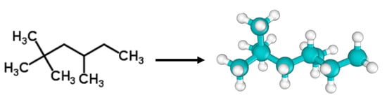 While the finite-size effect on viscosity is well understood [61], it is often found to be negligible [15,26,45,46,47]. First, two systems containing 100 and 1000 molecules of 2,2,4-trimethylhexane, shown in Figure 4, were studied to check for possible systematic errors due to finite-size effects. For each system size, 50 NVT trajectories, each 2 ns long, were used.