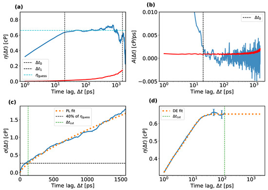 - Finally, the double-exponential model from Equation (4) is fitted with the curve_fit function from SciPy [59], to in the interval with a weight of , where b is taken from the power-law fit. The final viscosity is the long-term limit of the double exponential fit. See the dotted orange curve in Figure 2d. Note that other works exclude small values from the fit because the double-exponential model is not suitable for small time lags. Since the time integral of the stress tensor is stored only every picosecond, transient effects at small time lags are de facto excluded from the fits.A nonlinear regression may have multiple solutions, i.e., local minima of the least-squares cost function. To help the optimization algorithm, an initial guess can be specified, for which , and have been used. By making the values different, the symmetry of the model is effectively broken and this makes the optimizer less likely to get stuck at a saddle point. To further facilitate the regression, the parameters and are bounded to the interval . If one of the optimal parameters reaches its upper bound and the corresponding is non-zero, the solution is marked as invalid and is excluded from the remaining analysis.