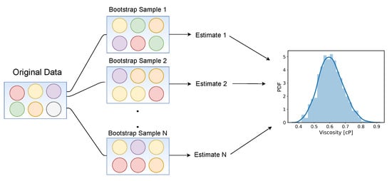 The schematic for the bootstrap resampling method for uncertainty quantification. The viscosity estimates have been obtained from each bootstrap sample, and a distribution was obtained using these estimates.