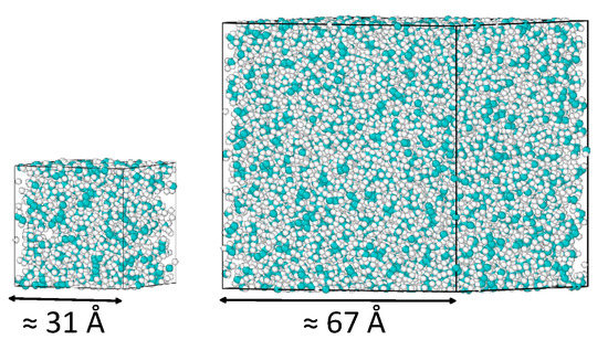 The simulation boxes containing 100 and 1000 2,2,4-trimethylhexane molecules. The carbon and hydrogens atoms are represented with cyan and white spheres, respectively—prepared using the Ovito visualization tool [43].