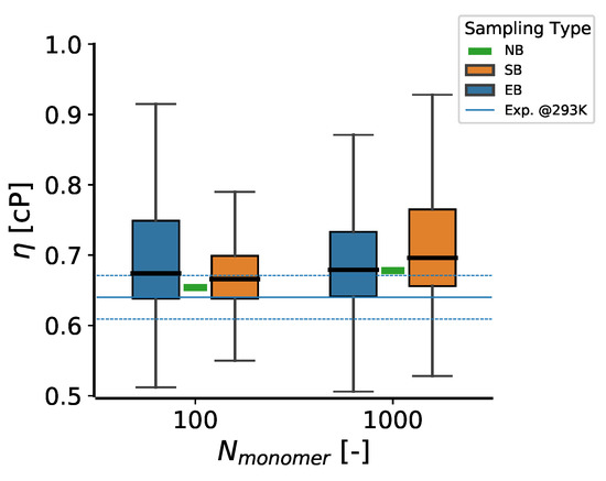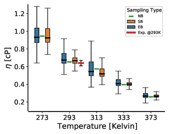 In summary, the post-processing of the MD simulations was carried out in three different ways. The first approach was not to carry out any bootstrapping or parameter sampling (NB), and to compute just a single viscosity with the default TDM settings. The second strategy was to apply bootstrapping only to the set of trajectories but to keep the ad hoc parameters still fixed at their recommended values, as performed in a few studies in the literature [15,35,58], to estimate the error in viscosity, which will be referred to as “Standard Bootstrapping” (SB). Finally, the third approach also accounts for uncertainties due to ad hoc parameters by randomly sampling them in the ranges of plausible values mentioned in the previous section to mimic the arbitrariness of human decision making, which will be called “Enhanced Bootstrapping” (EB). For the case of simulations at ambient conditions, the Monte Carlo method was also used to elucidate which ad hoc parameters linearly correlate with the predicted viscosity. For clarity, Table 1 lists all settings and how these settings differed in each of the three approaches.