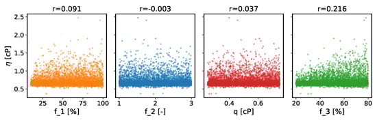 Scatter plots showing the dependence of the viscosity on the introduced fudge factors, namely, , , q, and . The Pearson correlation coefficient is shown on top of each panel.