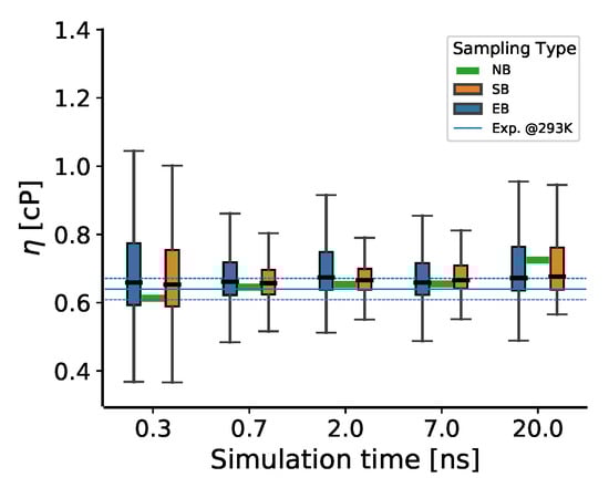 Figure 7 shows the viscosity distributions obtained with different sampling types. As expected, broader viscosity distributions were obtained for the shortest simulation time with both standard and enhanced bootstrapping due to the limited time available for the system to equilibrate and the increased susceptibility to fluctuations. In general, enhanced bootstrapping estimates larger uncertainties, due to the sampling of TDM heuristics, in line with the results shown above. The deviation in the median viscosity became relatively small from 2 ns. This analysis shows again the importance of bootstrapping: without it (NB), one may incorrectly conclude that even 20 ns simulations are insufficient to converge the viscosity.
