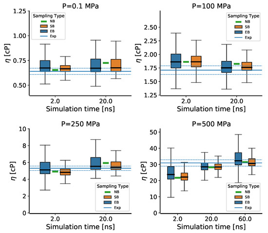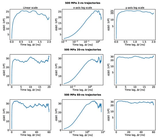 Therefore, in this section, the results are compared once again with varying individual trajectory lengths. The analysis of the trajectory lengths in Section 3.1 showed that 2 ns long trajectories are sufficient to obtain reliable viscosity estimates at ambient conditions. This time, the aim was to investigate to which pressure this trajectory length would be sufficient for reliable estimates. Therefore, the viscosity was calculated for two different cases: 50 NVT trajectories (1) each 2 ns long and (2) each 20 ns long. For 500 MPa pressure, the viscosity showed a pronounced increase with simulation time, which motivated us to extend these trajectories to 60 ns.