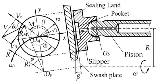If the revolution angular speed of the slipper was equal to the rotation angular speed [21], the circumferential velocity Vθ at a random point M in the running surface could be expressed as