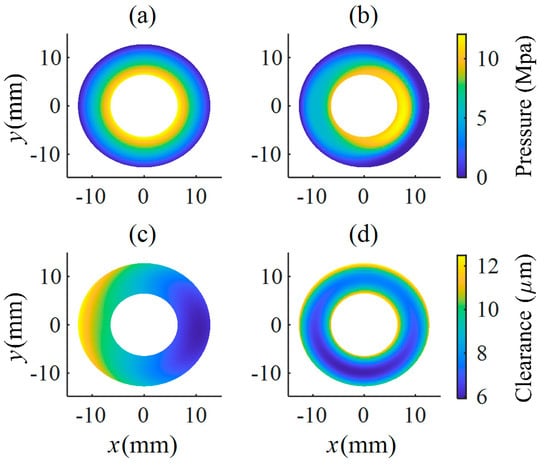Slipper B is tilted backward relative to the sliding direction and it forms a convergent wedgelike gap, which is shown in Figure 5c. The thickness field is symmetrical with the axis of y = 0, the minimum clearance point on the sealing land is located in the right semicircular, and the relative tilting angle is about 175°. Where the pressure of the oil film decreases exponentially along the radial direction [33], see Figure 5a, the integral value of the pressure in the left semicircle is higher than in the right semicircle, and the pressure in the lower semicircle is higher than in the upper semicircle.