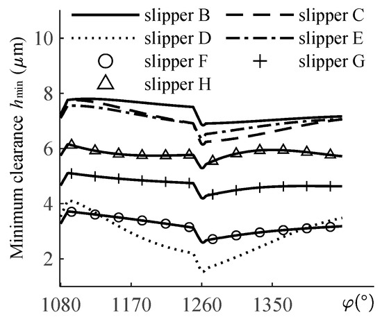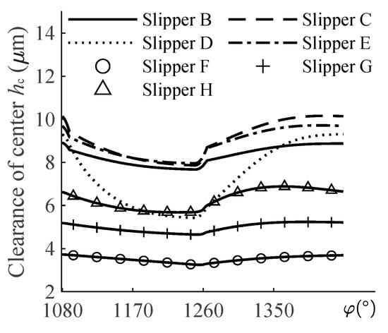 The curves of central thickness with rotation angles under different wear statuses are shown in Figure 7. The clamping force increased in the first half cycle; so, the oil film thickness is continuously descending. When the slipper enters the low pressure side, the central clearance gradually thickens. That is due to the reduction in elastic deformation and the change in inertia force. The thickness of the central oil film increases when Δho is slightly increasing, see the curves of slipper B, C, and E. The appropriate increase in Δho makes the dynamic lubrication effect enhanced; the slipper moves up and the central oil film becomes thicker. However, when the running surface is worn severely such as with slipper D, the dynamic bearing capacity is not enough to offset the loss of static pressure caused by tilting, and the whole oil film needs to be squeezed to balance the clamping force so that the central oil film will move down at the delivery phase. When considering the inner side wear, see the curves of slipper F, G and H, the dynamic bearing capacity is weakened. Therefore, the curve descends. It is equivalent to increasing the effective area of the pocket chamber with the increase in Δhi so that the bearing force of the slipper increases, and the oil film in the center of the slipper becomes thicker.