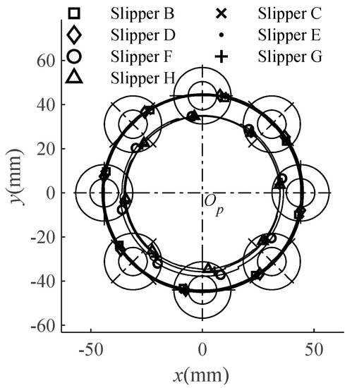 The trajectories of the minimum clearance point for one cycle at different wear statuses are shown in Figure 9, and the markings show the position of the minimum clearance point on the sealing land. Slipper B~Slipper E are running in a backward inclination, and the maximum tilting angle increases in the range of 175~180° with the increase in Δho, while the minimum clearance point moves inward along the radial direction. Slipper F~Slipper H are running in an outward and forward inclination, and the maximum tilting angle increases in the range of 35° to 75°, with the simultaneous increase in Δhi and Δho.
