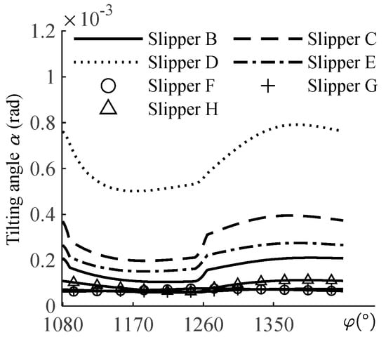 The curves of the maximum tilting angle in one cycle are shown in Figure 10, and the result shows the slipper tilts more obviously at the suction phase than at the delivery phase. The curves of the maximum tilting angle of slipper B~slipper E shifts upward, and the swing amplitude increases with the increase in Δho. The curve of slipper E shifts down significantly but swings more gently compared to slipper C which has the same value of Δho but a larger value of λr. It can be seen that the increase in λr contributes to the control of the maximum tilting angle. The anti-tilting capacity of the running surface is increased after taking Δhi into account. The maximum tilting curve of slipper F~slipper H decreases significantly, and increases slightly with the simultaneous increase in Δhi and Δho.