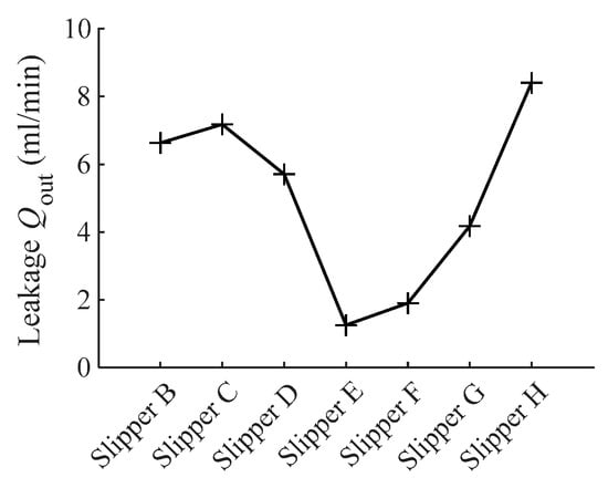 The average leakage of the slipper at the delivery phase for different wear statuses is shown in Figure 11. Leakage is related to the sealing clearance and sliding attitude. According to the variations in the central clearance presented in Figure 7, the leakages of slipper B~slipper E increase first and then decrease accordingly. It is worth noting that the slipper E wear contour vertex is shifted by 50% of the sealing land width compared with slipper C, and the leakage is decreased by 75.30%. The leakages of slipper F~slipper H, in line with the central clearance, gradually increase with the simultaneous increase in Δhi and Δho.
