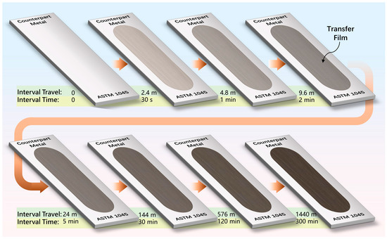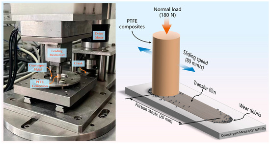 To examine the tribological characteristics of the PTFE composite, a linear reciprocating friction and wear tester (Model LSM-200, ZKKH Technology Development Co., Lanzhou, China) was employed, as shown in Figure 1. Before testing, the sample and counterpart metal surfaces were cleaned with acetone-soaked cotton balls. The specimens were loaded with a normal load of 180 N for a nominal contact pressure of around 6.3 MPa with an average linear velocity of 80 mm/s, and the ambient temperature was maintained at 25 °C. The total duration of the friction wear test for each specimen was 458.5 min (with a total stroke of 2200.8 m), and the test was split into seven separate trial phases (30 s, 1 min, 2 min, 5 min, 30 min, 2 h, or 5 h) to examine the progression of the PTFE composite’s tribological properties and the evolution of the morphological characteristics of the transfer film, as shown in Figure 2. After each independent stage of the friction test was completed, the specimen and the counterpart metal were carefully removed from the friction test machine. The specimen was weighed first to obtain the mass loss before and after the test, and the average volumetric wear rate K of the specimen in this stage was calculated according to Equation (1).