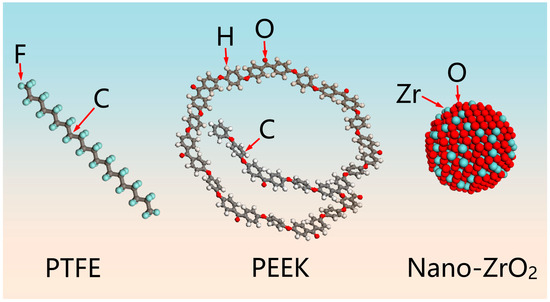 Molecular dynamics model structures of PTFE, PEEK, and nano-ZrO2.