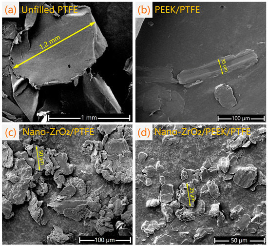 Four specimens were tested for frictional wear using a reciprocating friction tester. Figure 4 illustrates the variation of the volumetric wear rate and friction coefficient of the four materials during the friction process. Figure 4a shows that the volumetric wear rate of PTFE was initially as high as 7.7 × 10−4 mm3/Nm within the first 30 s of the friction experiment, which decreased to 2.9 × 10−4 mm3/Nm in the second stage. This indicated that pure PTFE had a straightforward process of fitting to the counterpart metal surface in the initial stage of the friction experiment. Therefore, the volumetric wear rate during this period was exceptionally high and unstable. During the steady friction phase, the volumetric wear rate of pure PTFE remained above 3 × 10−4 mm3/Nm. As a result, the pure PTFE specimens completed only six stages of friction wear testing (total friction time of 158.5 min and total friction distance of 760.8 m). A large volume of PTFE flake abrasive chips was continuously extruded from the friction interface during the friction process, as shown in Figure 5a. This phenomenon indicated an apparent interlayer slip motion between the molecular chains inside the PTFE matrix. This slip motion was caused by the repulsive force between the fluorine atoms surrounding the carbon–carbon molecular chain of PTFE and the fluorine atoms on other molecular chains. The volumetric wear rate of the PTFE composite filled with 10% PEEK exceeded 1 × 10−4 mm3/Nm in the first two stages. However, the volume wear rate decreased significantly thereafter, accompanied by the formation of filamentary abrasive chips, as shown in Figure 5b. Upon entering the stable friction stage, the volume wear rate of PEEK/PTFE decreased to less than 1 × 10−5 mm3/Nm. The addition of 8% ZrO2 nanoparticles significantly improved the wear resistance of the composites. During the initial friction stage, the volume wear rate of nano-ZrO2/PTFE was even lower than that of PEEK/PTFE, and at the stable friction stage, the volume wear rate of nano-ZrO2/PTFE was reduced to less than 1 × 10−5 mm3/Nm, slightly higher than that of PEEK/PTFE. The debris of both composites exhibited a powder-like morphology in the late friction stage, as depicted in Figure 5c. This indicated that PEEK and nano-ZrO2, dispersed in the PTFE matrix and acted as a skeleton support, improving the creep resistance, compressive strength, and hardness of the composites and thereby effectively inhibiting the interlayer slip between the PTFE molecular chains in the late friction stage.