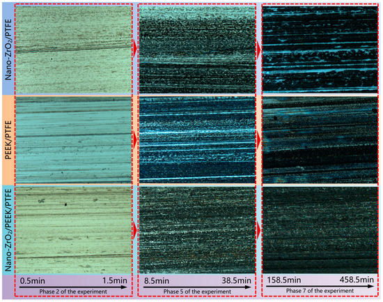 During the friction process of polymers, some of the material near the friction surface of the specimen is transferred to the surface of the counterpart metal, with a portion deposited and adhered to the surface of the counterpart metal to form a thin film-like transition layer known as the “transfer film” [23,24]. The properties of the transfer film play a critical role in the tribological properties of polymeric materials, and various reinforced filler modifications significantly influence its development and properties. As shown in Figure 6, this study obtained optical images of the transfer film of PTFE composites filled with PEEK and ZrO2 nanoparticles adhering to the surface of the counterpart metal at different friction stages.
