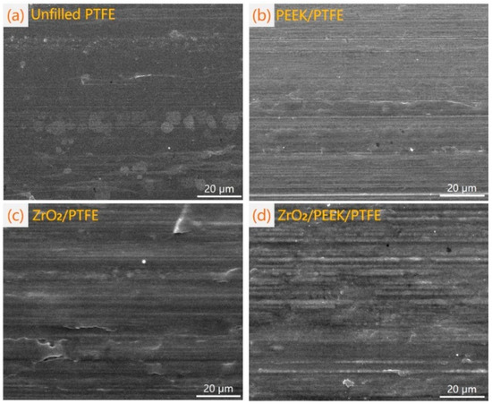 SEM images of the surfaces of the counterpart metal: (a) unfilled PTFE, (b) PEEK/PTFE, (c) nano-ZrO2/PTFE, (d) nano-ZrO2/PEEK/PTFE.