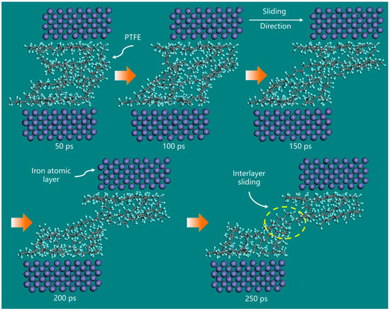 The frictional behavior between pure PTFE and the Fe atomic layer was simulated using molecular dynamics, as shown in Figure 9. During the first 200 ps, the upper structure of the PTFE matrix gradually moved to the right with the motion of the top Fe atomic layer, resulting in significant interlayer slippage. As the simulation progressed to 200 ps, the central structure of the PTFE matrix started to undergo shearing and tearing, leading to gradual delamination. Eventually, at 250 ps, the matrix was completely split into upper and lower parts. As shown in Figure 10, the distribution of atomic concentrations in the PTFE matrix revealed a high relative atomic concentration in the upper and lower regions of the matrix within 10 and 40 Å near the Fe atomic layer, while the concentration in the middle region was relatively lower. This phenomenon was attributed to the repulsion between the fluorine atoms that encased the carbon–carbon molecular chain backbone of PTFE, which resulted in inadequate capacity within the matrix to resist the shear forces generated by friction. As a consequence, the PTFE molecular chains experienced interlayer slip motion, leading to the aggregation of chains towards the friction region at the upper and lower ends of the matrix. Molecular dynamics simulations confirmed that this slip motion caused high volumetric wear rates and the generation of large abrasive debris.