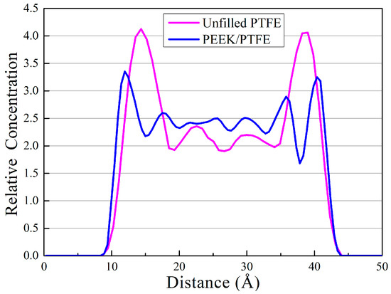 Distribution of the relative concentration of atoms within unfilled PTFE and PEEK/PTFE matrix.