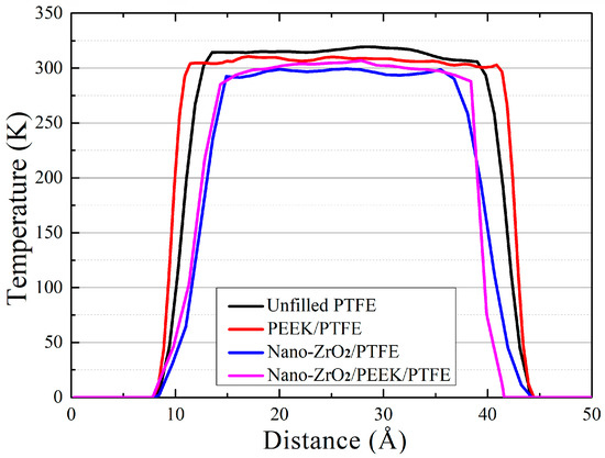 Figure 11 shows the trend of the atomic temperature within the PTFE matrix along the model height. It was observed that the atomic temperature exceeded 315 K in the region from 15 to 33 Å within the matrix, forming a temperature plateau. The highest temperature of 320 K occurred near 29 Å within the matrix. The significant temperature increase in the PTFE matrix’s middle was due to the strong frictional interaction between the PTFE molecular chains and the resulting interlayer movement within the matrix. At the same time, the increase in the frictional temperature between the molecular chains enhanced the viscoelastic properties of the PTFE matrix. This manifested itself on a macroscopic scale as the pure PTFE materials were prone to adhesive wear during friction.