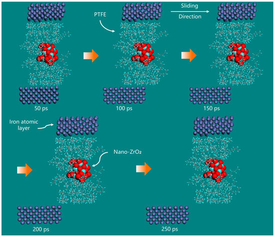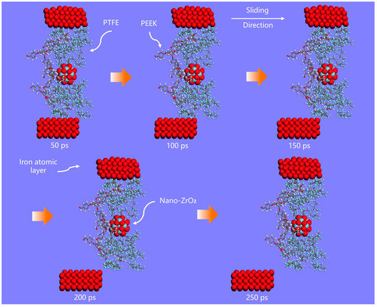 Figure 13 and Figure 14 depict the friction process between the Fe atomic layer and two nanocomposites, namely nano-ZrO2/PTFE and nano-ZrO2/PEEK/PTFE, simulated using molecular dynamics. The ZrO2 nanoparticles embedded within the polymer matrix were tightly wrapped by the PTFE and PEEK/PTFE molecular chains, respectively. Acting as a rigid skeleton, the nanoparticles supported the surrounding polymer molecular chains, anchoring them and enhancing the rigidity of the composite materials. Consequently, when subjected to the sliding and shearing effects of the Fe atomic layer on top, there was no interlayer slip of molecular chains within the matrix. The overall structure maintained excellent stability and integrity throughout the 250 ps friction process. Figure 11 demonstrates the effect of adding ZrO2 nanoparticles on the internal temperature of the matrix. The simulated temperature within the nano-ZrO2/PTFE and nano-ZrO2/PEEK/PTFE matrices was significantly lower than at corresponding positions within pure PTFE and PEEK/PTFE, with the internal temperature of the nano-ZrO2/PTFE matrix being below 300 K. The simulation results indicated that the addition of ZrO2 nanoparticles significantly enhanced the antishear deformation ability of the PTFE composite, effectively suppressing intermolecular friction and interlayer slip within the matrix and significantly improving the tribological properties of the PTFE composites. These results were consistent with those obtained from reciprocating friction and wear tests on PTFE composites filled with ZrO2 nanoparticles.