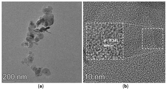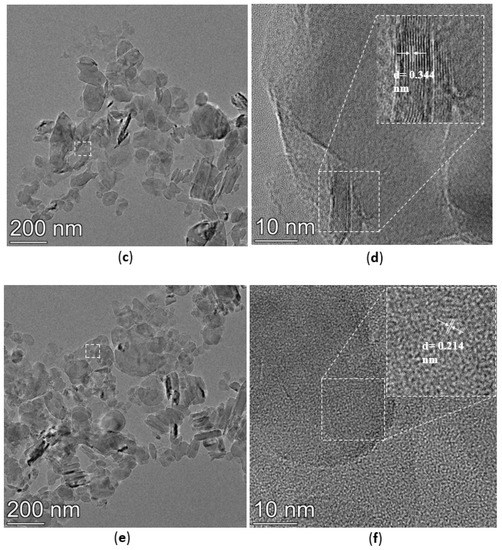 The TEM images of h-BN, h-BN-OH, and h-BN-NH2 are shown in Figure 5. The crystal plane spacing of unmodified h-BN is 0.341 nm (Figure 5a,b). After immersion in NaOH solution, the h-BN surface is loaded with hydroxyl groups, the crystal plane spacing of h-BN-OH is 0.344 nm (Figure 5c,d), and the crystal plane spacing of h-BN-OH is slightly greater than that of h-BN [30]. The TEM images of h-BN-NH2 are shown in Figure 5e,f; h-BN after being ball-milled, h-BN surface loaded with -NH2 after ball-milling by urea, and the crystal plane spacing of h-BN-NH2 is 0.214 nm [31]. The relative thickness of h-BN can be visually estimated through its transparency. In Figure 5a, the h-BN shows low transparency and tends to stack with relatively thick layers. However, h-BN-OH and h-BN-NH2 on the substrate tend to be transparent (Figure 5c,e), indicating the few-layer structure of functionalized h-BN [32].