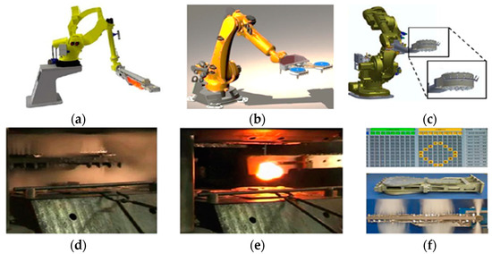 Examples of lubricating system solutions: (a) with the use of manipulators and blow-out of scale [56], (b) with possibility of simultaneous lubrication both dies—preliminary and finishing, (c) simultaneous lubrication of the upper and lower tool, (d) a mobile insertable plate with the option of predefining the lubricating openings—entry of the lubricating plate and start of lubrication, (e) view of a manipulator with a gripper inserting a preform [65], and (f) panel of the lubricating device with a system of active (selected) nozzles.