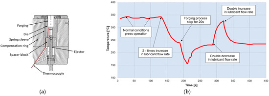 Own research: (a) a scheme of the thermo-couple mounted into the tool set and (b) a view of the temperature distribution and changes of the die during forging with the indicated disturbances in the process.