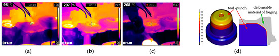 Results of thermal camera recorded during a cycle of 7 s with the temperature distributions on the tool-punch in the process of making a disk forging: (a) the cycle of tool lubrication—the temperature in the marked point equals 95 °C, (b) 3 s after the lubrication—the temperature goes up about 100 °C, (c) just 1s of the end of the forging process, and (d) the field of temperature distribution on the analyzed tool during forging obtained from FE modelling [55].