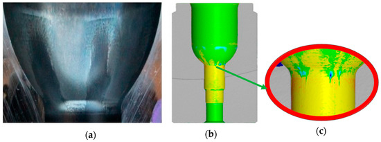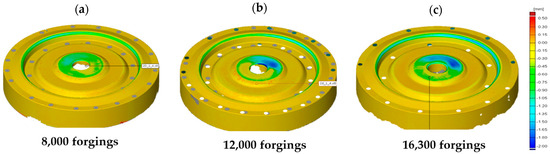 The 3D scanning results for the lower tools used to forge a spur wheel with the use of the elaborated lubrication system: (a) a die after producing 8000 forgings, (b) 12,000 forgings, and (c) inserts after 16,300 forgings.