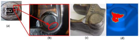 Cracking of the die inserts in the lowest area of the working impression caused by the remaining lubricant residue: (a) the die inserts with indicated area of accruing defects, (b) a magnification of the cavity image of the formed cracks, (c) an underfill of the forging as a result of “closed” volumes of grease or air, and (d) the results of numerical modelling with the use of the “trap” function (red color means unfilled).