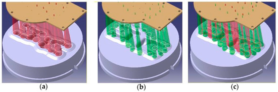 The openings in the board were divided into two main sections. The first section had openings with the diameter of 3 mm and a spraying angle of 4°, which ensured a complete covering of the deepest and largest areas of the working impression (Figure 7a). In turn, Figure 6b shows a solution consisting of lubrication of the so-called die bridge, which is the key area of the tool due to the intensive flow of the material into the flash, which favors intensive abrasive wear of this area, hence the required precise lubrication and the use of openings with the diameter of 2 mm and the angle of 3° in the second section. Figure 7c presents an optimal solution of a simultaneous operation of both sections in such a way that the openings in Section 1 are replaced by the openings in Section 2, which cover the areas of operation of Section 1. This makes it possible to precisely spray the impression with the bridge without “over-lubrication” of the remaining part of the tool, which is not working abrasively. Of course, it is necessary to perform further tests under industrial conditions.