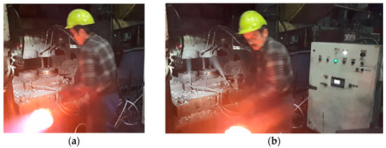 Figure 4 presents an image of a semi-automatic lubrication technique realized on crank presses by way of manually setting the lubrication nozzles based on the operator’s experience and knowledge. In this case, the direction of the lubricant supply depends on the position of the nozzles set by the operator. Excessive lubrication (Figure 4a) can cause disadvantageous properties of the forging and premature wear of the tools as a result of thermal shocks. Similarly, a lack of sufficient control of the lubrication process and an improper position of the nozzles in the process can be the cause of non-uniform wear (Figure 4b), which intensifies the areas exposed to abrasive wear and thermo-mechanical fatigue and significantly shortens the performance time of the tools as well as lowers the quality of the forging.