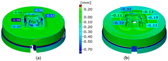 The developed cooling–lubricating system was also applied in another forging process—hot die forging of a spur wheel forging. The mean durability of the dies used in this process, by means of the old semi-automatic lubricating device, equaled about 7000–8000 forgings; after this number of forgings, due to loss of dimensions on the radius of the flash material’s exit, the tools were removed from further production. The global results obtained from the 3D scanning of the lower die inserts used in the roughing operation after an increasing number of forgings are presented in Figure 11.