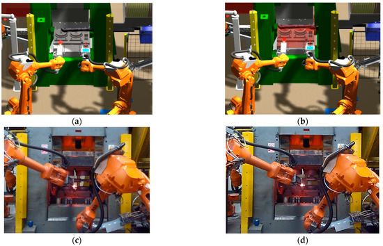 Robotic production cell on a crank press with developed automated cooling–lubrication system: (a) results of simulation by Robot Studio software—before lubrication, (b) during lubrication—simulation, (c) before lubrication—industrial process, and (d) during the cooling and lubricating process by means of an automatically driven lubricating plate-industrial condition.